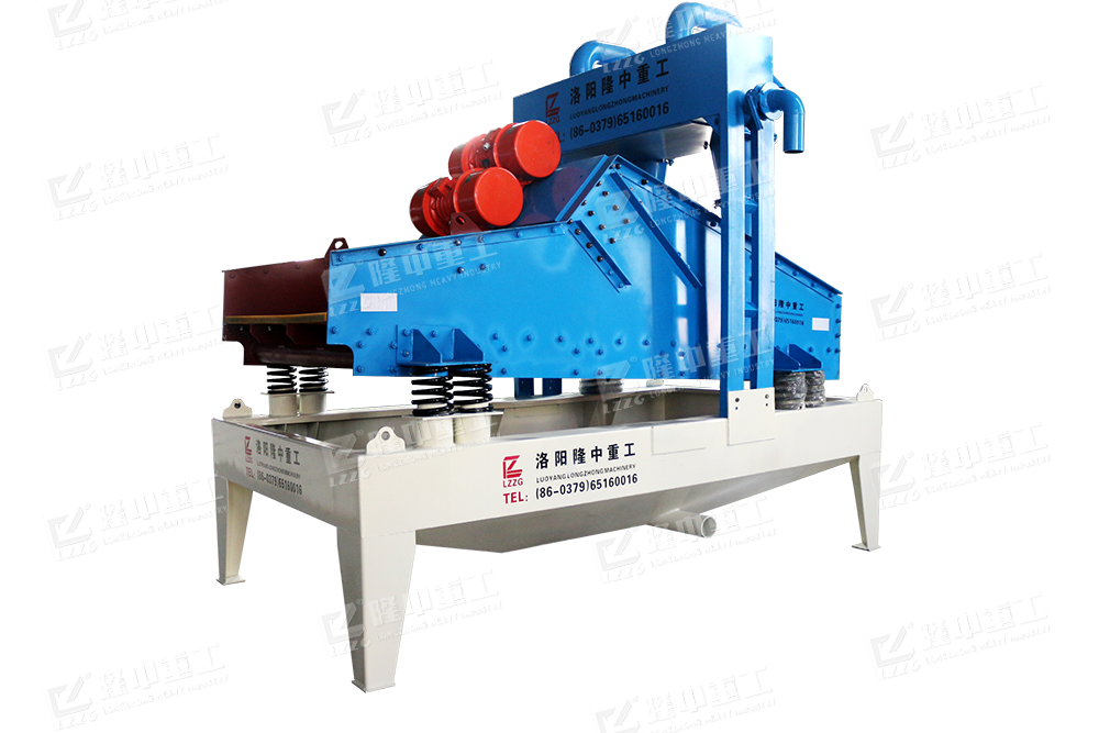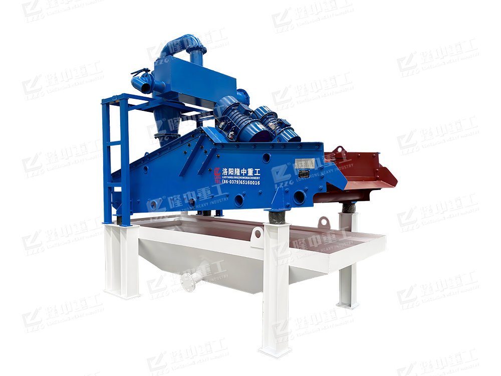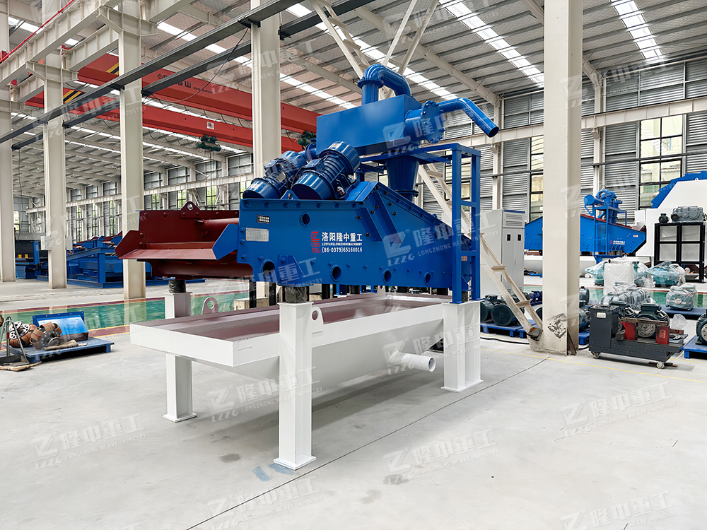 2、工作流程:洗沙機撈出的粗砂直接進入脫水型細沙回收機的篩面,通過篩機和振動電機的帶動,并結(jié)合篩機設計的負傾角爬坡結(jié)構(gòu),物料在篩面上高頻振動形成濾層并脫水,從而實現(xiàn)粗砂脫水功能;而洗砂機溢流的洗砂廢水則進入到該設備清洗箱中,經(jīng)由底部真空高壓泵抽至旋流器中進行分級濃縮,通過高速離心力和額定的入料壓力,旋流器將洗砂廢水中的細沙與水分離,而后將濃度被提升至60-70%的細沙通過沉沙嘴排入振動脫水篩表面,在高頻振動電機的帶動下,實現(xiàn)細沙的脫水回收,而其他的廢水、泥、粉等雜質(zhì)則通過旋流器溢流口進入返水箱排出。